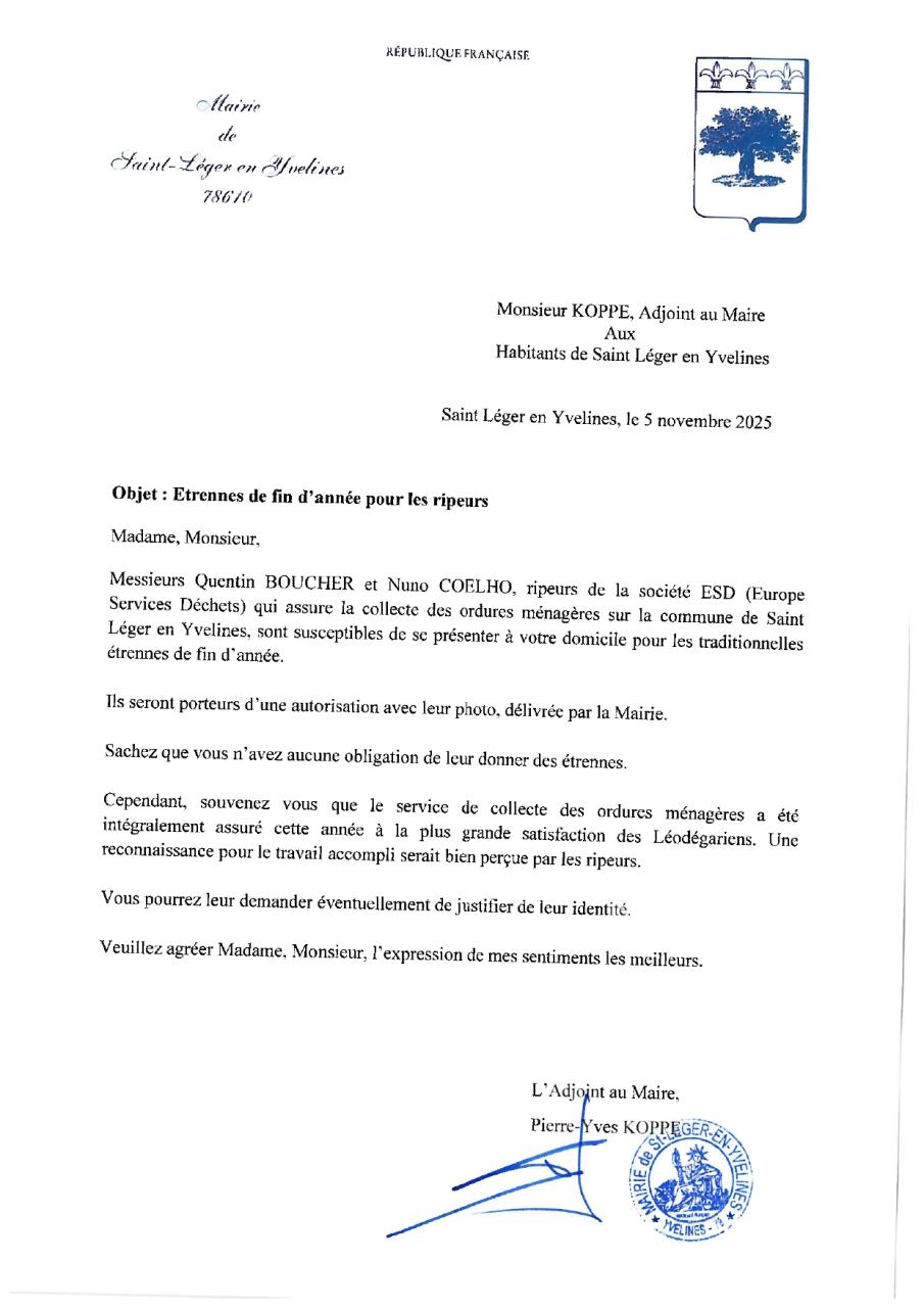 Veuillez trouver ci joint un courrier de Monsieur KOPPE, 1er Adjoint au Maire en charge des finances, concernant les étrennes des ripeurs du SITCOM.